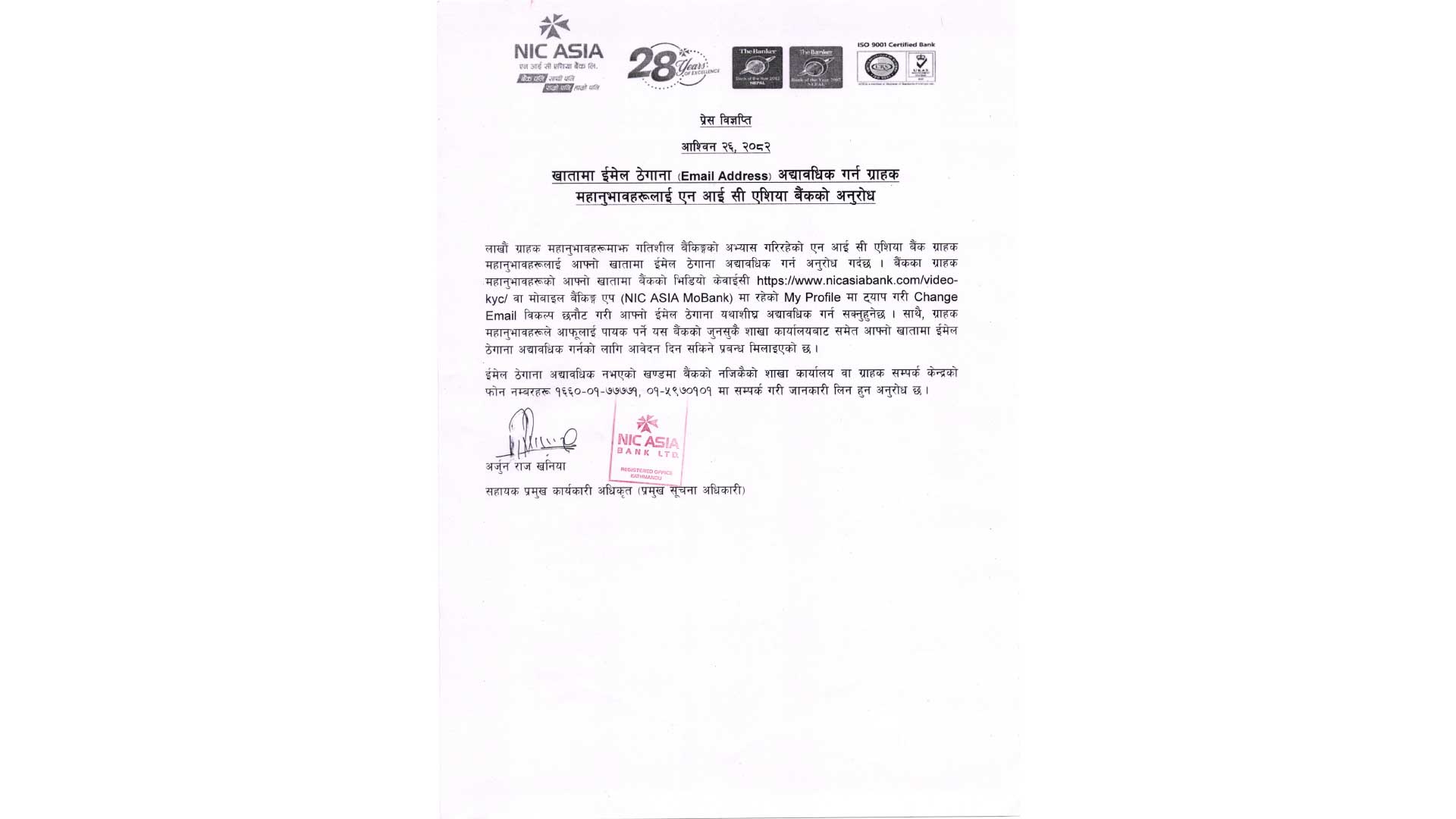 एनआईसी एशिया बैंकले ग्राहकलाई खाताको ईमेल ठेगाना अद्यावधिक गर्न आग्रह