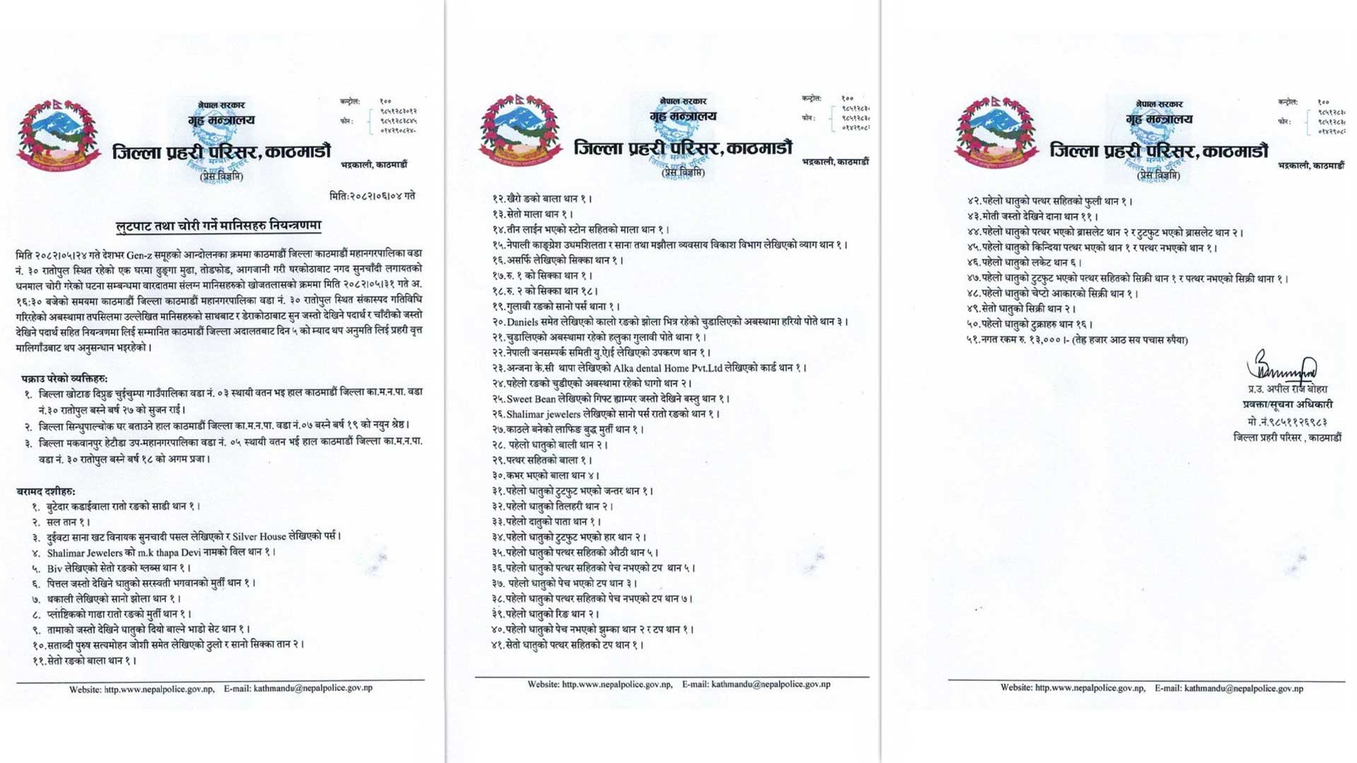 जिल्ला प्रहरी परिसर काठमाडौंका अनुसार, आन्दोलनकै भीडभाडमा ढुंगामुढा, तोडफोड र आगजनीपछि घरभित्र प्रवेश गरी चोरी गरिएको थियो। लामो खोजतलासपछि प्रहरीले तीन जनालाई पक्राउ गरेको छ—खोटाङ दिप्रुङ चुईचुम्पा–३ का २७ वर्षीय सुजन राई, सिन्धुपाल्चोकका १९ वर्षीय नयुन श्रेष्ठ, र मकवानपुर हेटौंडा–५ का १८ वर्षीय अगम प्रजा। ती तीनै जना रातोपुलकै क्षेत्रमा बसोबास गर्दै आएका थिए। उनीहरूको डेराबाट सुनजस्तो र चाँदीजस्तो देखिने पदार्थ बरामद गरिएको प्रहरीले जनाएको छ। अदालतबाट पाँच दिनको म्याद लिएर मालिगाउँ प्रहरी वृत्तले थप अनुसन्धान गरिरहेको छ।