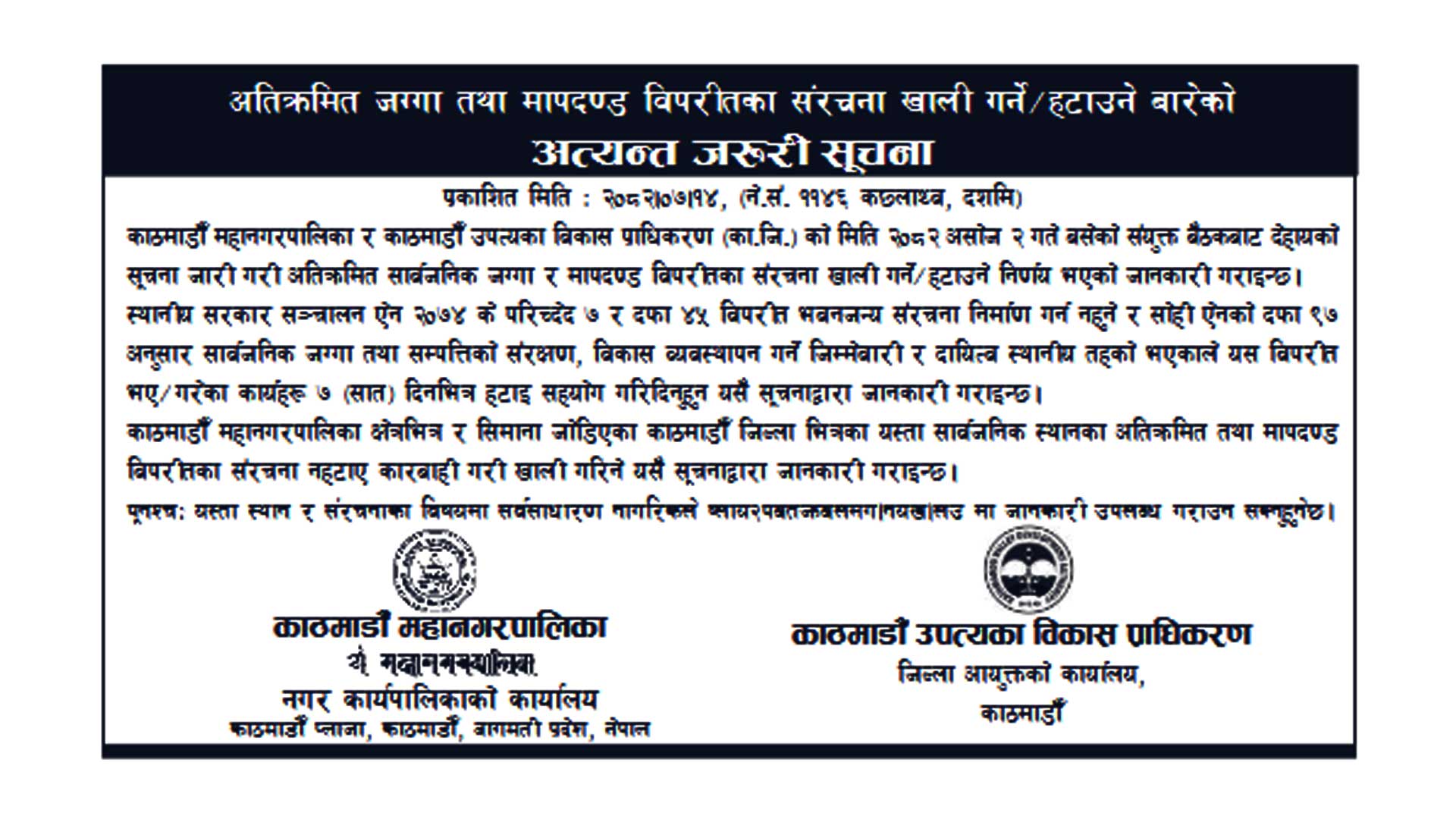 सूचनामा उल्लेख गरिएको छ कि असोज २ गते बसेको संयुक्त बैठकले सार्वजनिक जग्गा अतिक्रमण र मापदण्ड विपरीतका संरचना खाली गर्ने निर्णय गरेको थियो। सो निर्णयअनुसार अब सात दिनभित्र सम्बन्धित व्यक्तिले आफैंले संरचना नहटाए कारबाही गरी जग्गा खाली गरिने चेतावनी दिइएको हो।