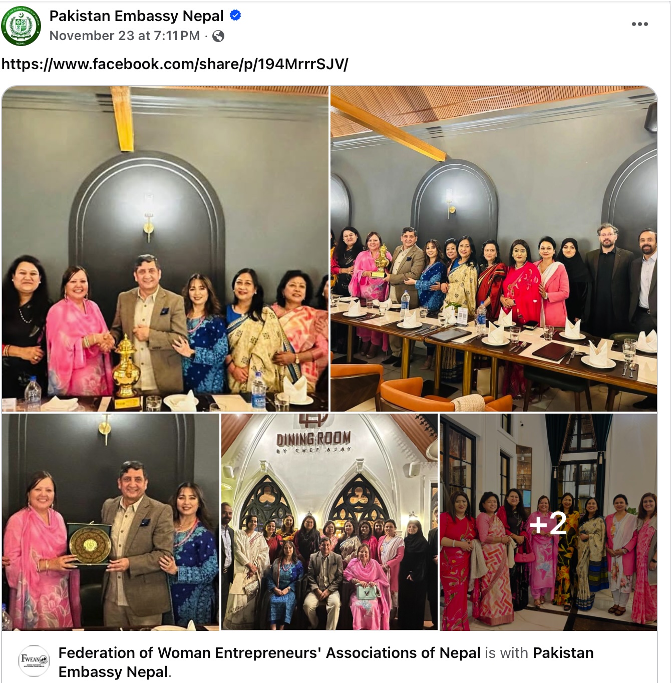 FWEAN का अनुसार, पाकिस्तान दूतावासले विभिन्न अध्याय विस्तार, राष्ट्रिय–अन्तर्राष्ट्रिय सम्मेलन र उद्यमशीलता अभिवृद्धिमा निरन्तर साथ दिँदै आएको तथ्य संस्थागत अभिलेखमा पाइन्छ। यही कारण महिला उद्यमीहरूको उच्चस्तरीय टोली—उपाध्यक्षहरू दर्शना श्रेष्ठ, सुनीता वैद्य श्रेष्ठ, बसन्ती प्रधान, महालक्ष्मी श्रेष्ठ, महासचिव कुन्नम पोखरेल, सचिव सुमित्रा पलाञ्चोके, कोषाध्यक्ष साविता सुवेदी तथा कार्यकारी निर्देशक अभिलाषा पौडेल—समेत उक्त कार्यक्रममा सहभागी भएको मिति र विवरण संस्थाले नै पुष्टि गरेको हो।