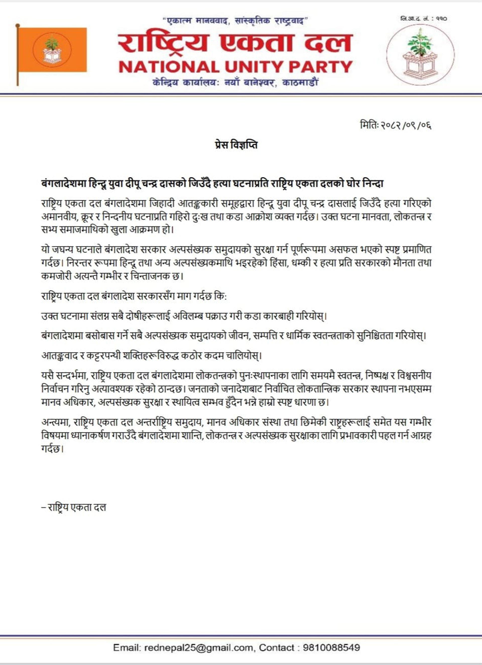 राष्ट्रिय एकता दलद्वारा जारी विज्ञप्तिमा बंगलादेश सरकार अल्पसंख्यक समुदायको सुरक्षा गर्न असफल भएको आरोप लगाइएको छ। विज्ञप्तिमा बंगलादेशमा हिन्दू तथा अन्य अल्पसंख्यकमाथि निरन्तर भइरहेको हिंसा, धम्की र हत्याप्रति सरकारको कमजोरी गम्भीर र चिन्ताजनक भएको उल्लेख गरिएको छ।