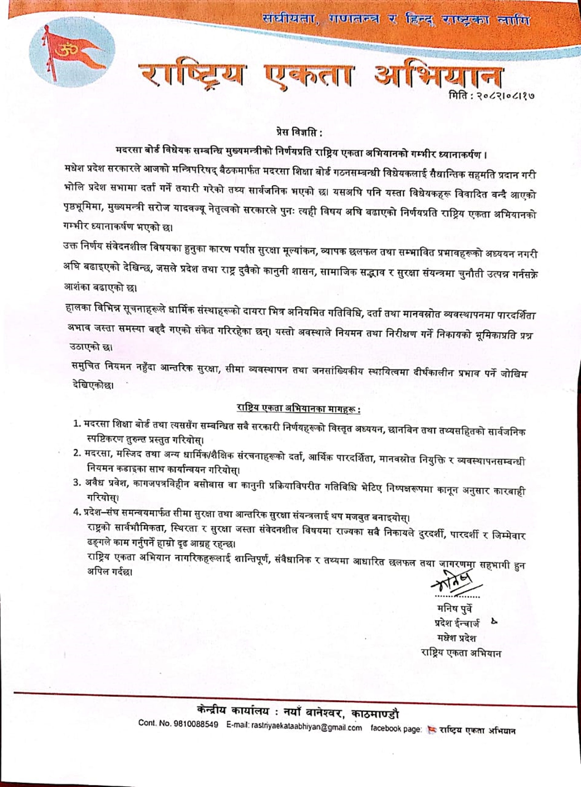 मदरसा बोर्ड विधेयक तथा यससम्बन्धी सबै सरकारी निर्णयको तथ्याधारित अध्ययन, छानबिन र सार्वजनिक रूपमा स्पष्टिकरण तुरुन्त प्रस्तुत गर्न माग।