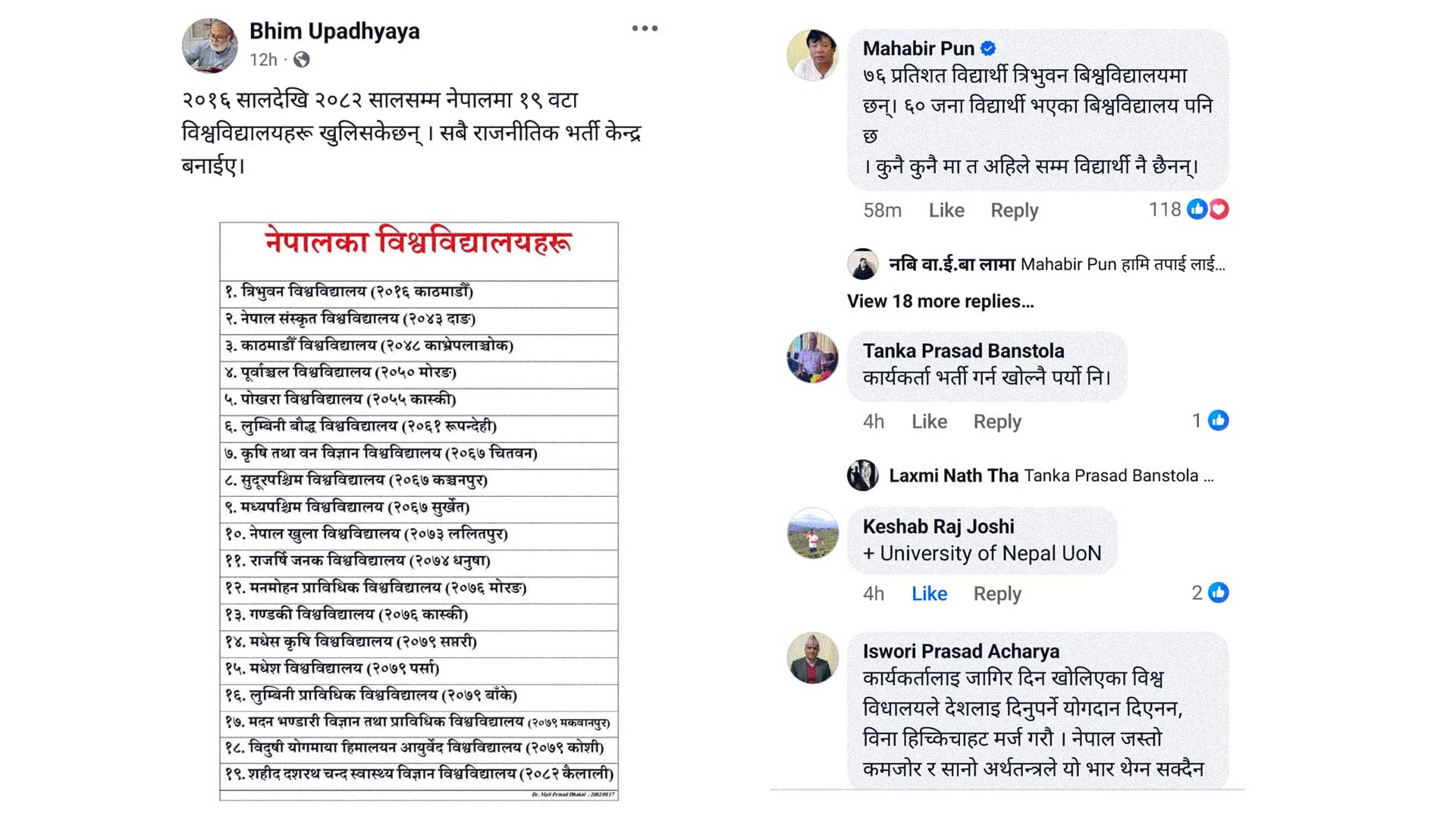 उपन्यायको पोस्टलाई प्रतिक्रिया दिंदै शिक्षामन्त्री महाविर पुन स्वयं फेसबुकमै उभिए। उनले “७६ प्रतिशत विद्यार्थी अझै पनि त्रिभुवन विश्वविद्यालयमै छन्, केही विश्वविद्यालयमा त जम्मा ६० जना विद्यार्थी छन्, कतिपयमा त अहिलेसम्म विद्यार्थी नै छैनन्,” भन्दै संरचनात्मक विकृति स्वीकारे। मन्त्री पुनको टिप्पणीले दुईवटा तीतो यथार्थ एकसाथ उजागर गर्यो—एकातिर दशकौँदेखि सुधार नआएको त्रिभुवन विश्वविद्यालयमाथिको अत्यधिक निर्भरता, अर्कोातिर योजना–विना खोलेका नयाँ विश्वविद्यालयहरूमा देखिएको विद्यार्थी सङ्ख्याको भयावह खालीपन।