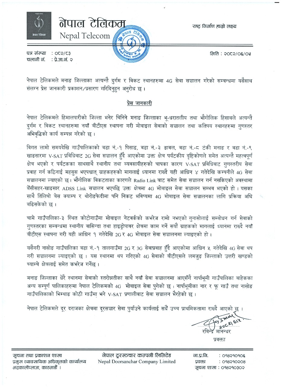 नेपाल टेलिकमले मनाङ जिल्लाका दुर्गम तथा भौगोलिक दृष्टिले विकट ठहरिएका स्थानमा नयाँ बेस ट्रान्ससीभर स्टेसन (बीटीएस) स्थापना गर्दै मोबाइल सेवा सञ्चालनमा ल्याएको छ। कम्पनीका अनुसार पर्यटक र स्थानीयको चाप बढेसँगै पुरानो सीडीएमए प्रविधिबाट मात्र गुणस्तरीय सेवा दिन कठिनाइ भएकोले असोज ४ गतेदेखि थप ४जी सेवा सुरु गरिएको हो।
