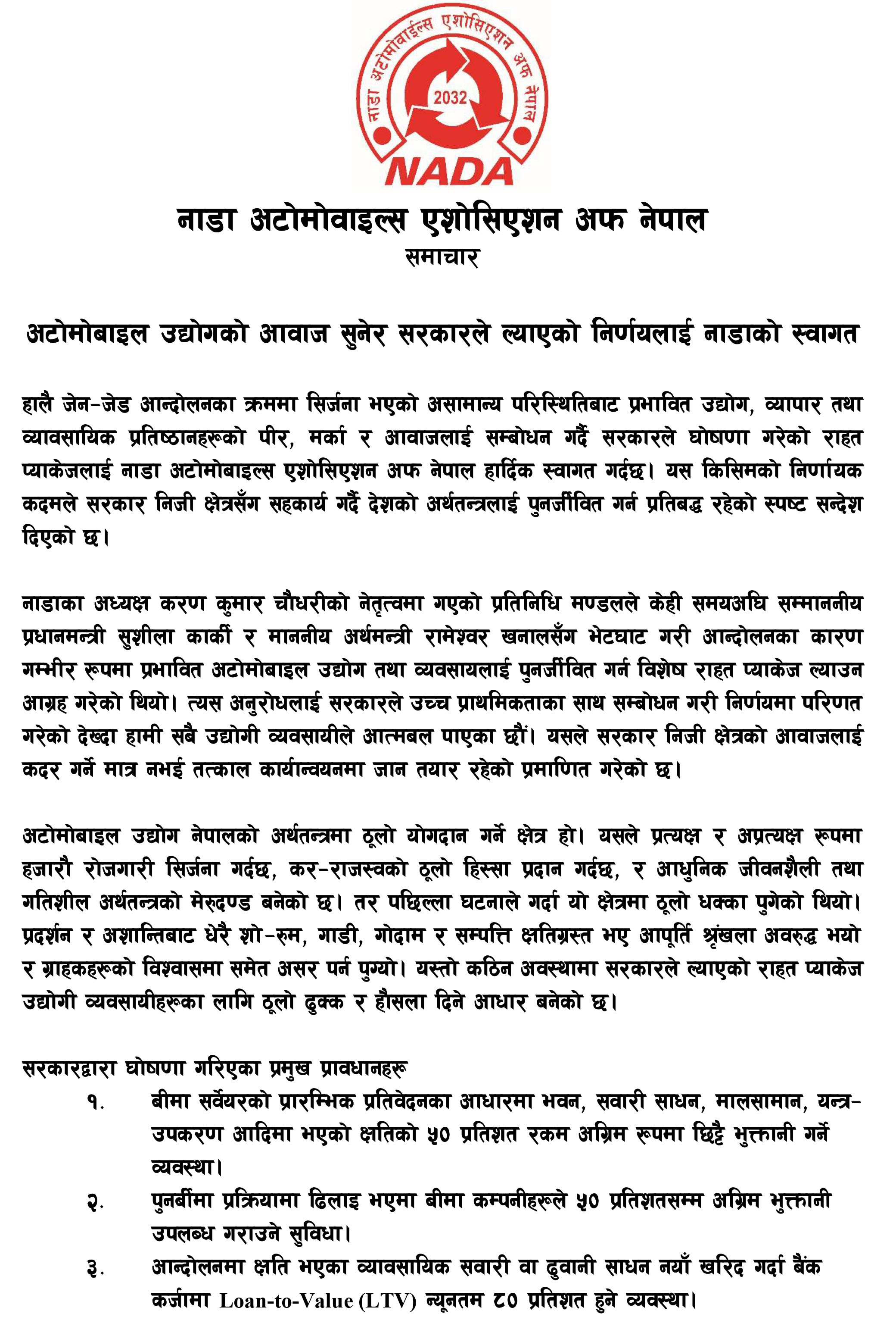 नाडाका अध्यक्ष करणकुमार चौधरीको नेतृत्वमा गएको प्रतिनिधिमण्डलले केही दिनअघि प्रधानमन्त्री सुशीला कार्की र अर्थमन्त्री रामेश्वर खनाललाई अटोमोबाइल उद्योग गम्भीर रूपमा प्रभावित भएको भन्दै राहत प्याकेज ल्याउन आग्रह गरेको थियो। संघका अनुसार उक्त मागलाई सरकारले प्राथमिकताका साथ सम्बोधन गर्दै बीमा अग्रिम भुक्तानी, सहुलियत कर्जा, कर–भन्सारमा छुट र ऋणी व्यवसायीका लागि अवधि थप्ने जस्ता प्रावधानसहितको प्याकेज सार्वजनिक गरेको छ।