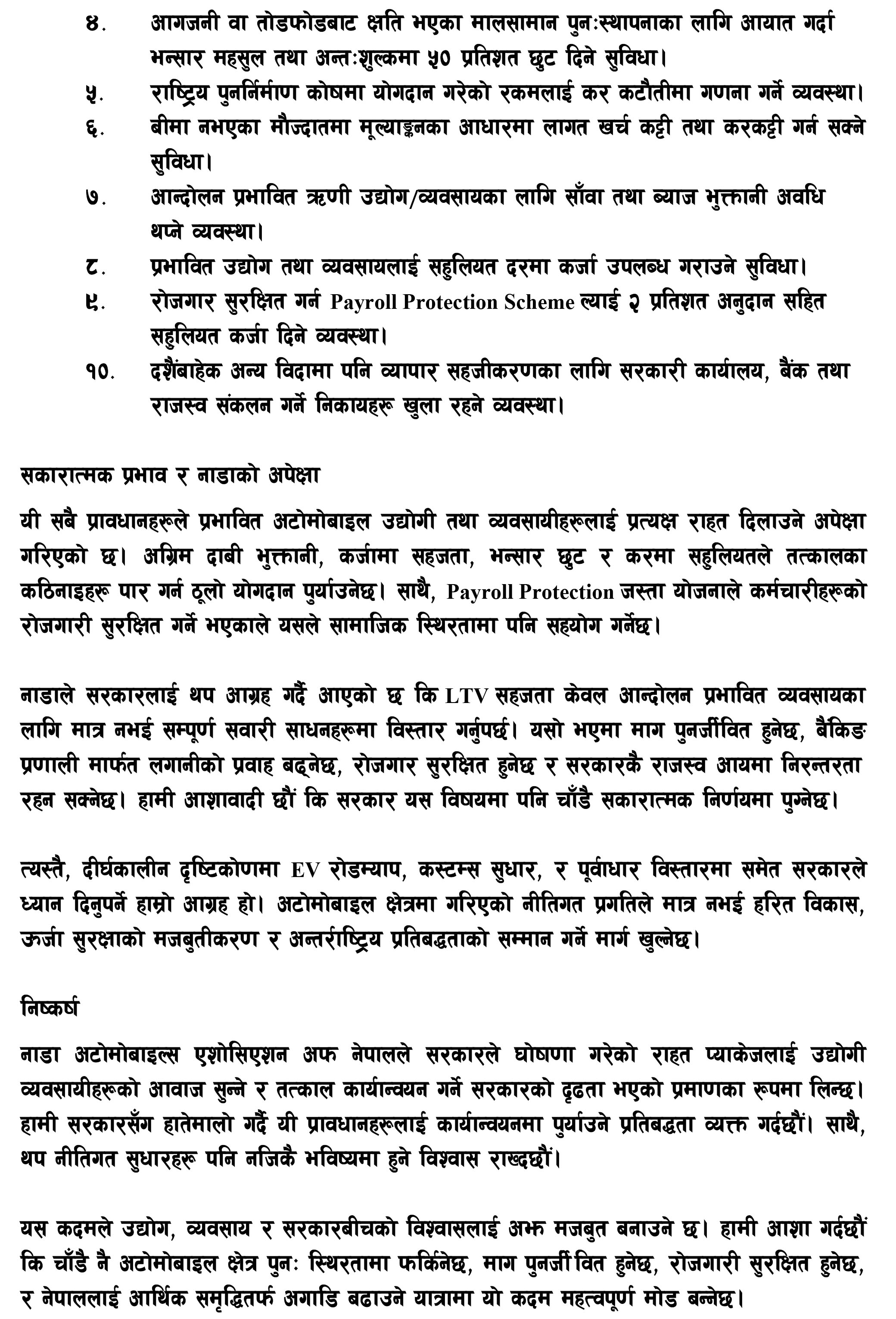 यससँगै नाडाले राहतको दायरालाई अझ व्यापक बनाउन सरकारसँग आग्रह गरेको छ। संघका अनुसार आन्दोलन प्रभावित व्यवसाय मात्र नभई सम्पूर्ण सवारीसाधन क्षेत्रलाई सहजता दिने खालका निर्णयले माग पुनर्जीवित हुने, लगानी प्रवाह बढ्ने, रोजगारी सुरक्षित हुने र राजस्वमा निरन्तरता रहनेछ। दीर्घकालीन रूपमा कस्टम्स सुधार, पूर्वाधार विस्तार र हरित विकासतर्फ उन्मुख नीतिगत प्रगतिको आवश्यकता पनि संघले औंल्याएको छ।