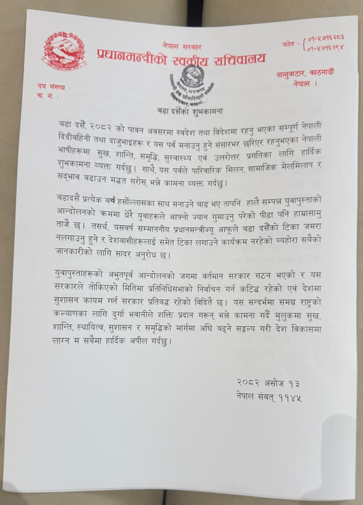 दशैंको अवसरमा प्रधानमन्त्री कार्कीले स्वदेश तथा विदेशमा रहेका सम्पूर्ण नेपालीलाई शुभकामना दिँदै चाडलाई व्यक्तिगत शोक मात्र नभई साझा सांस्कृतिक मूल्य र जिम्मेवारीका रूपमा मनाउन आग्रह गरेकी छन्।