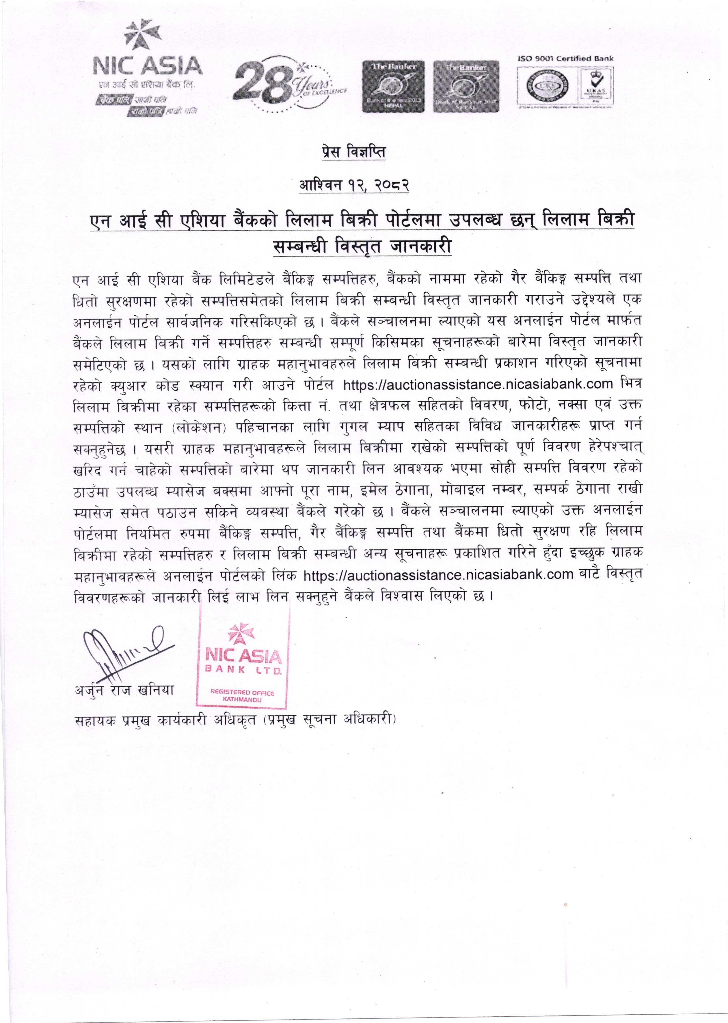 एन आई सी एशिया बैंकद्वारा लिलामी सम्पत्तिको विवरण उपलब्ध गराउने अनलाइन पोर्टल सञ्चालन!