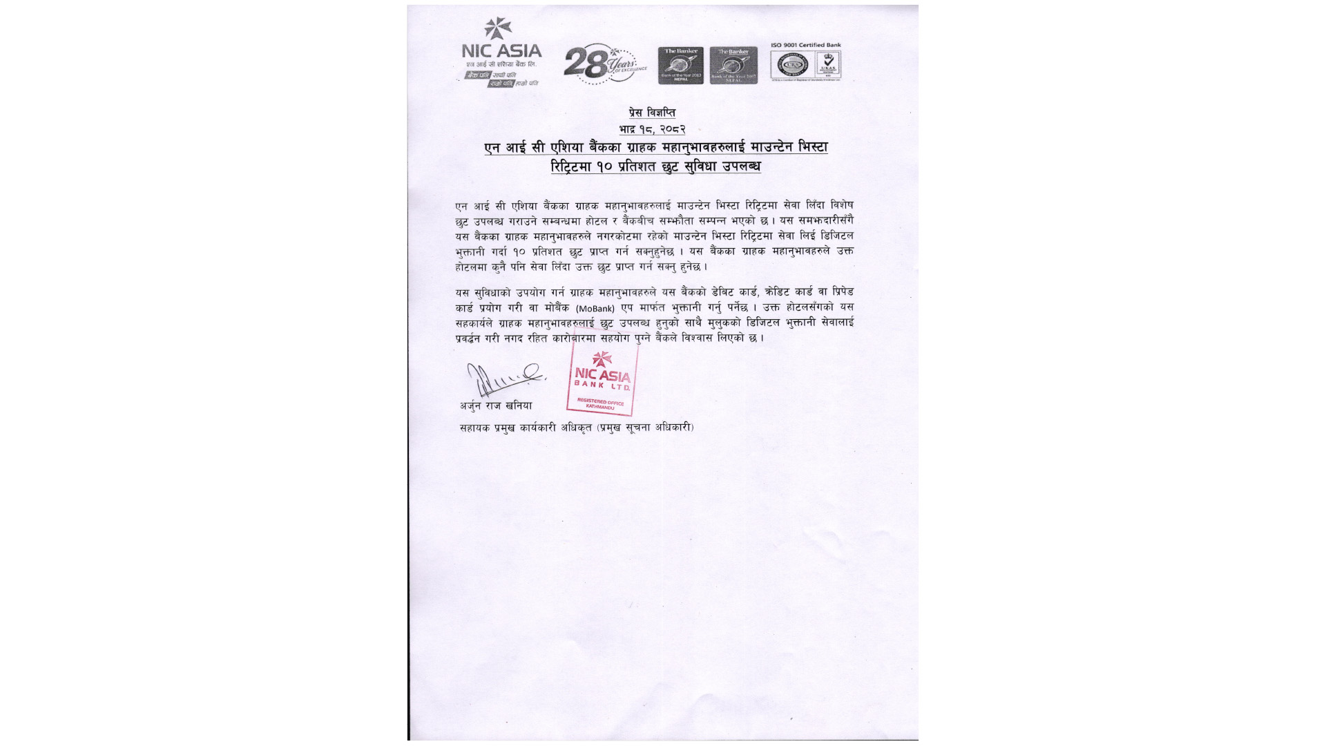 एनआईसी एशिया बैंकका ग्राहकले अब नगरकोटस्थित माउन्टेन भिस्टा रिट्रिटमा सेवा लिँदा १० प्रतिशत छुट पाउने भएका छन्। भदौ १८ मा जारी विज्ञप्तिअनुसार, बैंक र होटलबीच सम्झौता सम्पन्न भएपछि उक्त सुविधा लागू भएको हो।