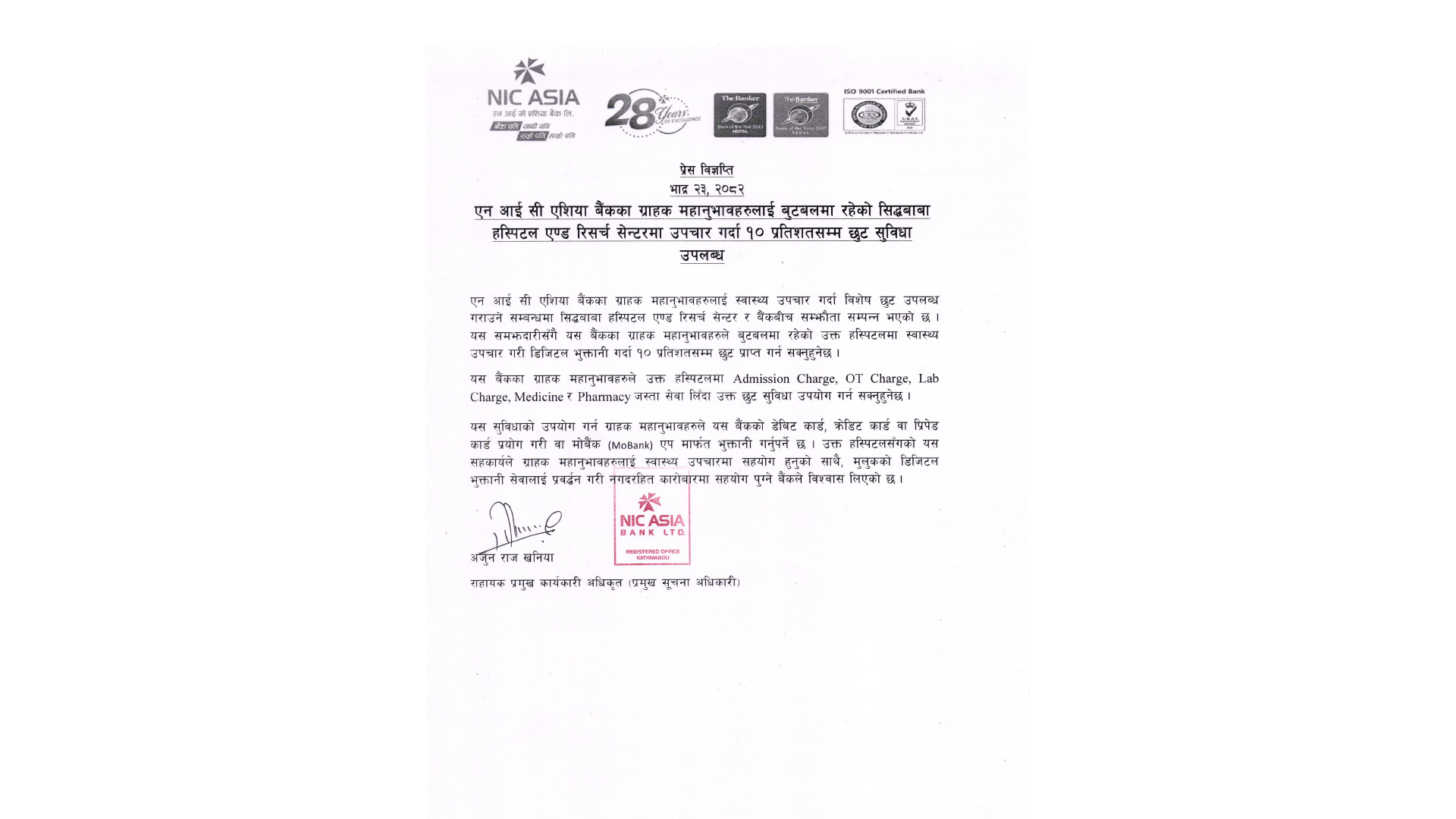 अब उपचारमा पनि बचत! एनआईसी एशिया बैंकका ग्राहकलाई सिद्धबाबा हस्पिटलमा १०% छुट